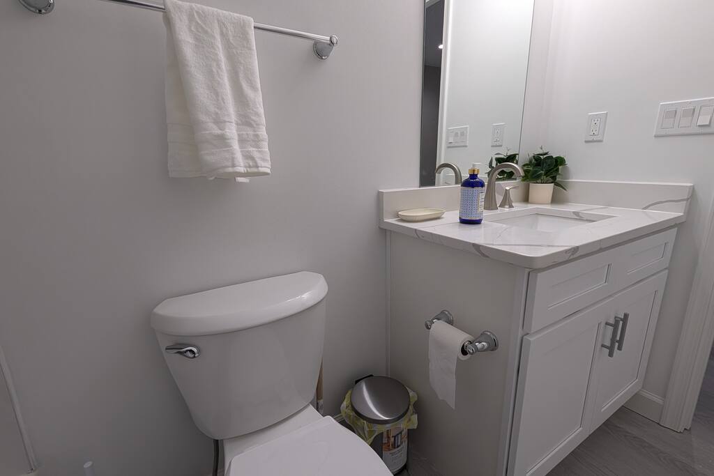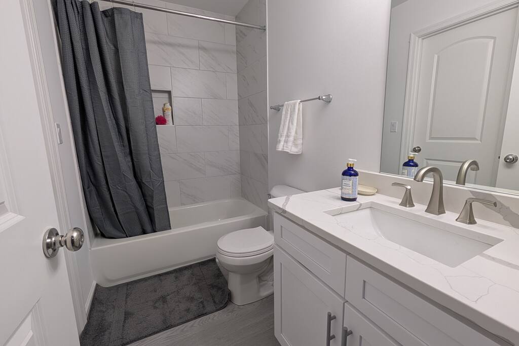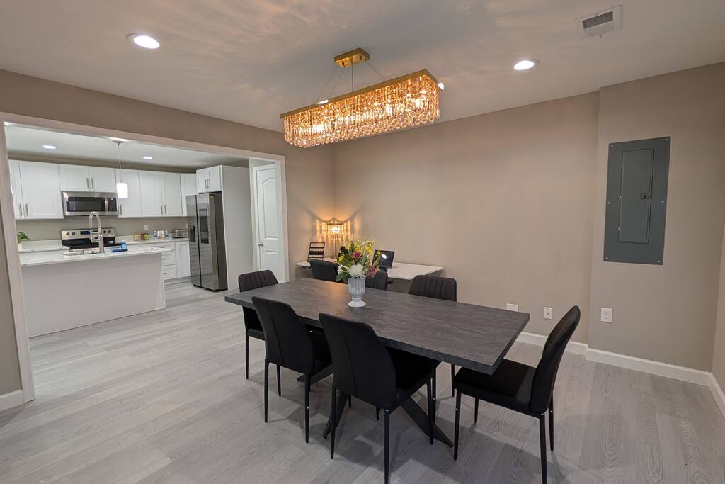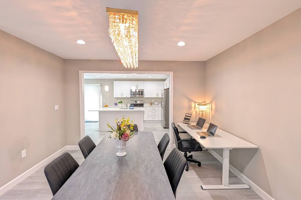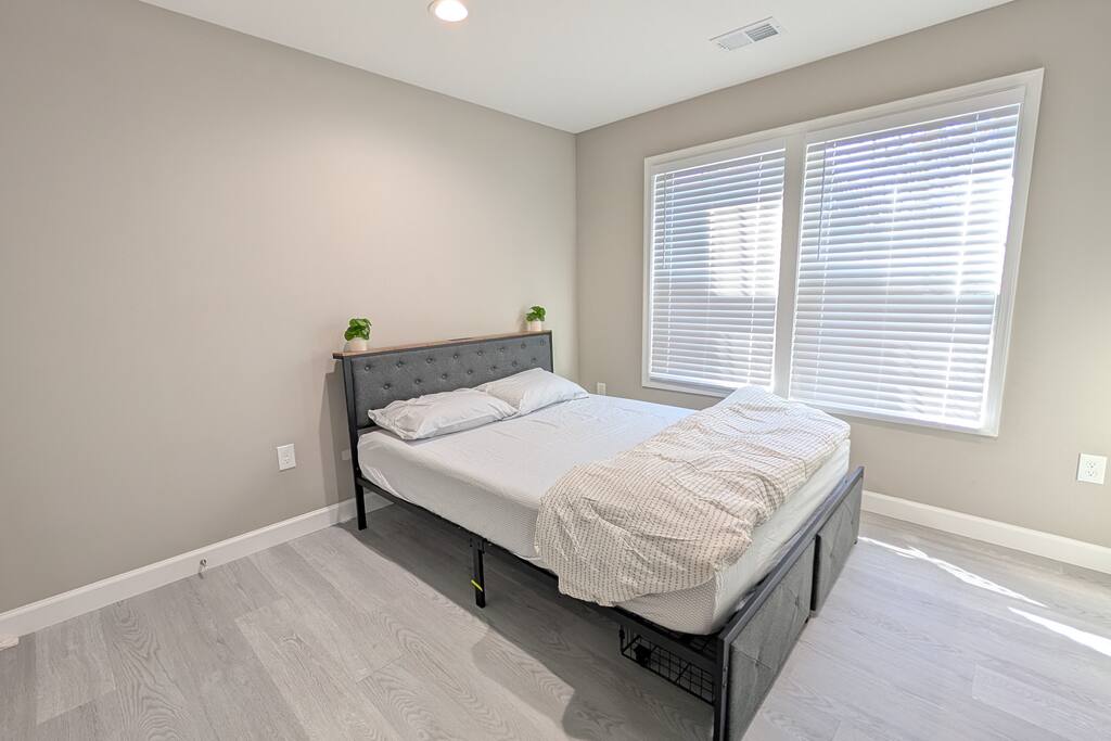 A spacious Room with a Private Bath on the main level of a modern Single-family home. The bedroom features a queen bed, a dresser, a nightstand, a closet, and a smart TV. The shared areas of the home include a fully equipped kitchen, a large open living area, a Dining room, a Breakfast corner, a Workspace table, open-concept living, and a fenced backyard. Perfect for extended stay visitors, travelling professionals, and students.