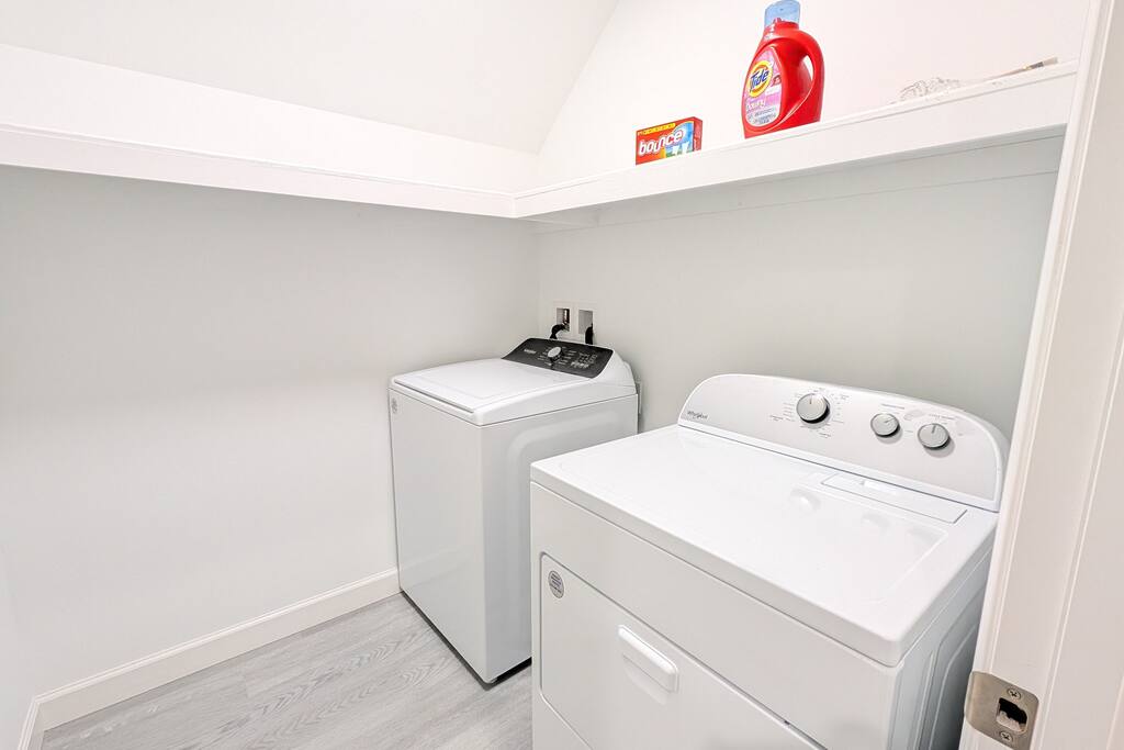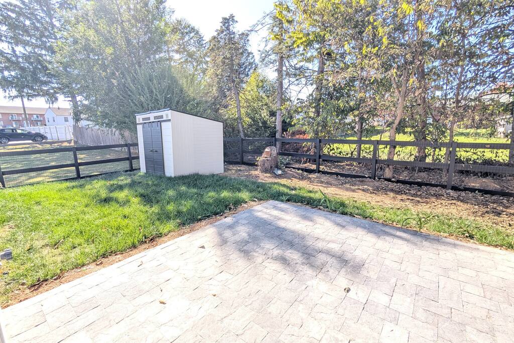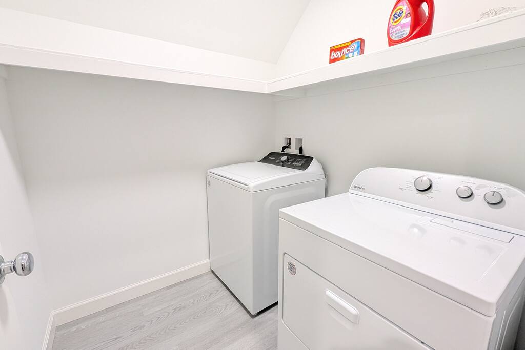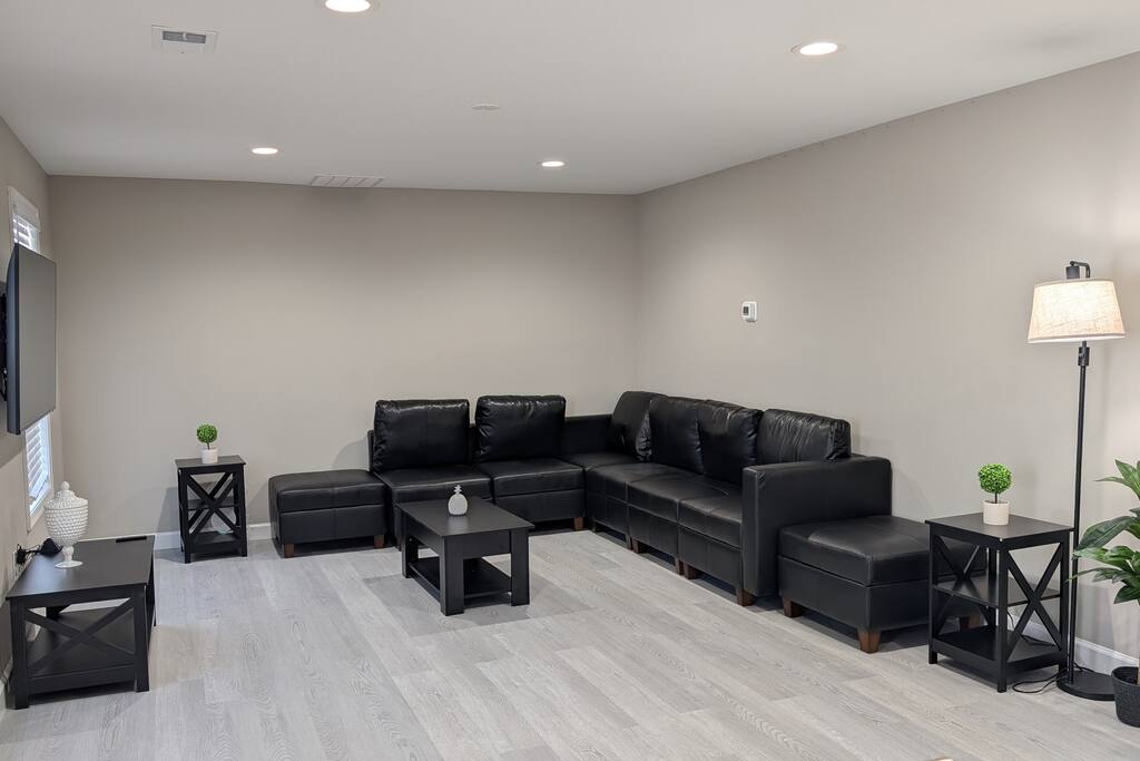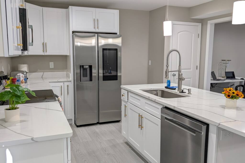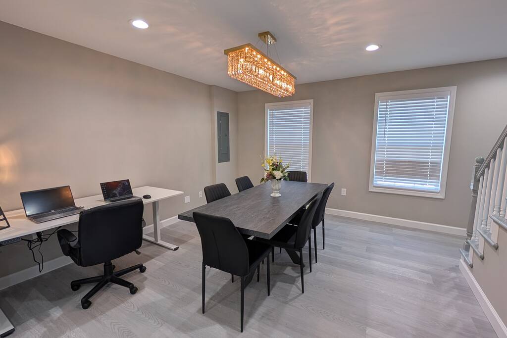 A spacious Room with a Private Bath on the main level of a modern Single-family home. The bedroom features a queen bed, a dresser, a nightstand, a closet, and a smart TV. The shared areas of the home include a fully equipped kitchen, a large open living area, a Dining room, a Breakfast corner, a Workspace table, open-concept living, and a fenced backyard. Perfect for extended stay visitors, travelling professionals, and students.